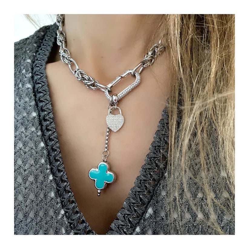 Stainless steel byzantine fancy chain with cubic zirconia brass clasp and two charms. Heart charm is with cubic zirconia and cross is enamel turquoise. You can wear with charms, without charms or with either charm to give it 4 different looks.