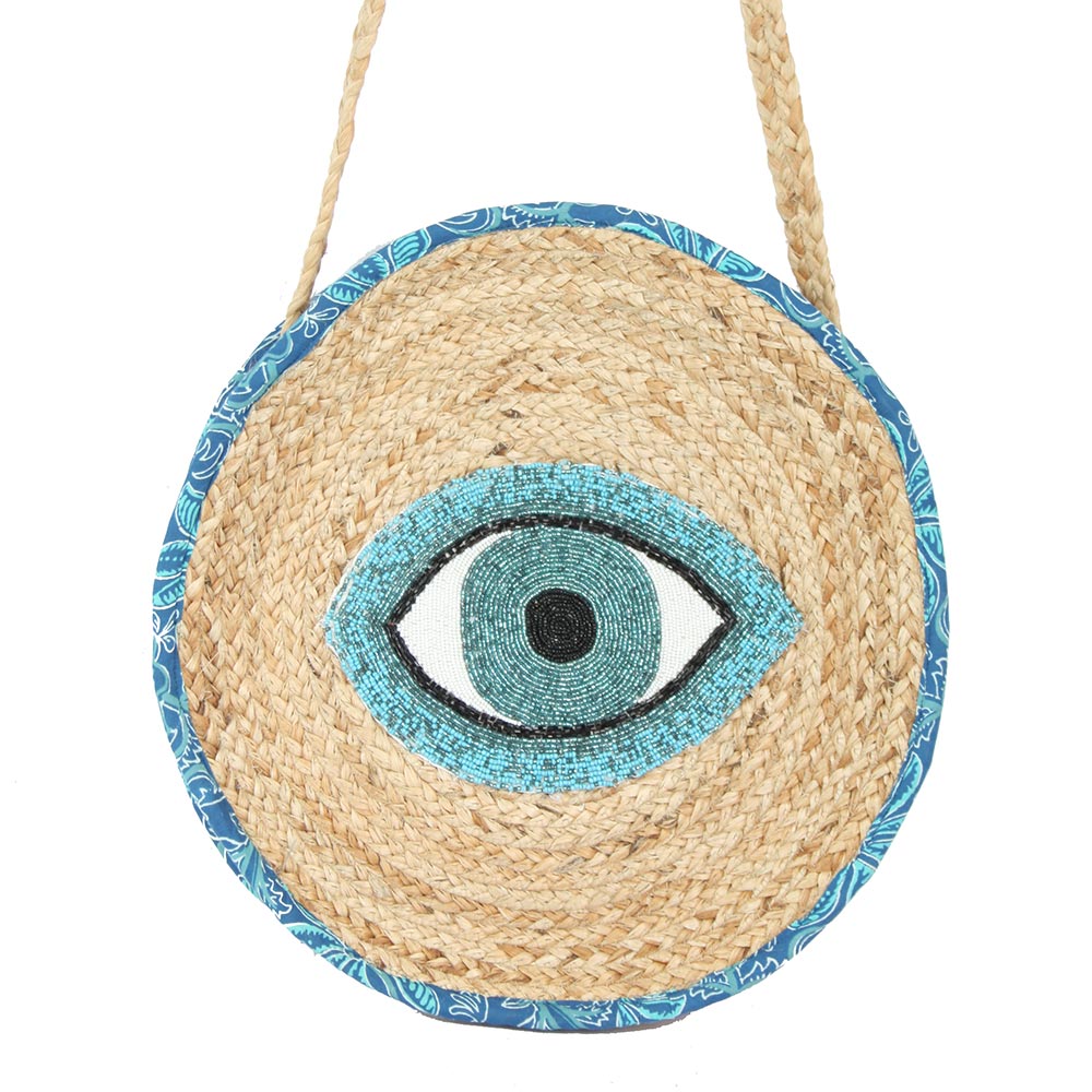 • Statement round shoulder bag featuring a bold evil eye motif and structured woven silhouette. Designed to carry daily essentials with ease while adding a playful, protective-inspired accent to any outfit. Ideal for vacations, casual outings, and boutiques seeking eye-catching, trend-driven accessories.