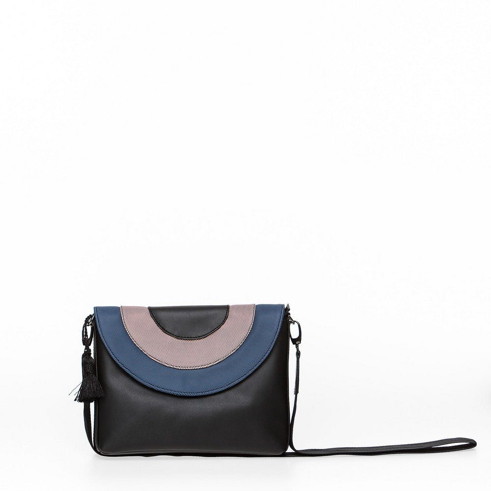 Medium size leatherette bag in black color and cap combined with blue dusty pink and black. Zip closure. Belt detail in black and tassel in black. Inner lining with black cotton lining and inside pocket.