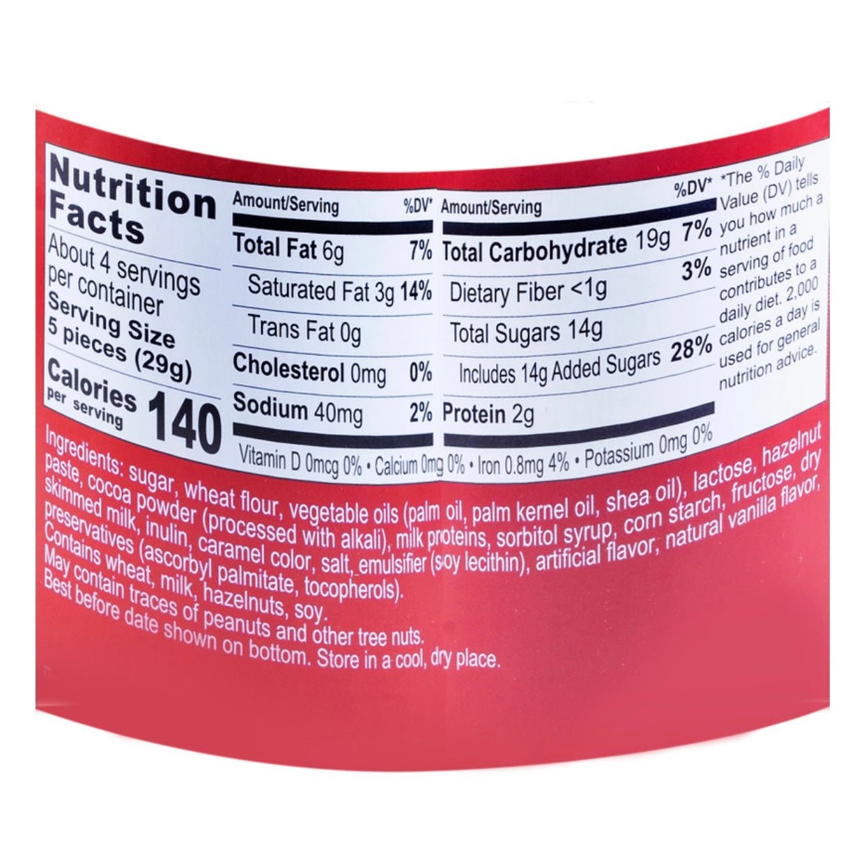 - Sugar, wheat flour, vegetable oils (palm oil, palm kernel oil, shea oil), lactose, hazelnut paste, cocoa powder, milk proteins, sorbitol syrup, corn starch, fructose, dry skimmed milk, inulin, caramel color, salt, emulsifier (soy lecithin), artificial flavor, natural vanilla flavor, preservatives (ascorbyl palmitate, tocopherols)