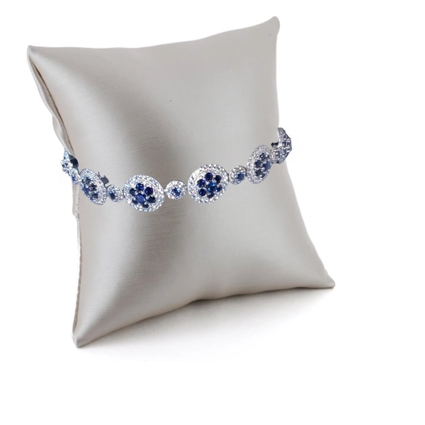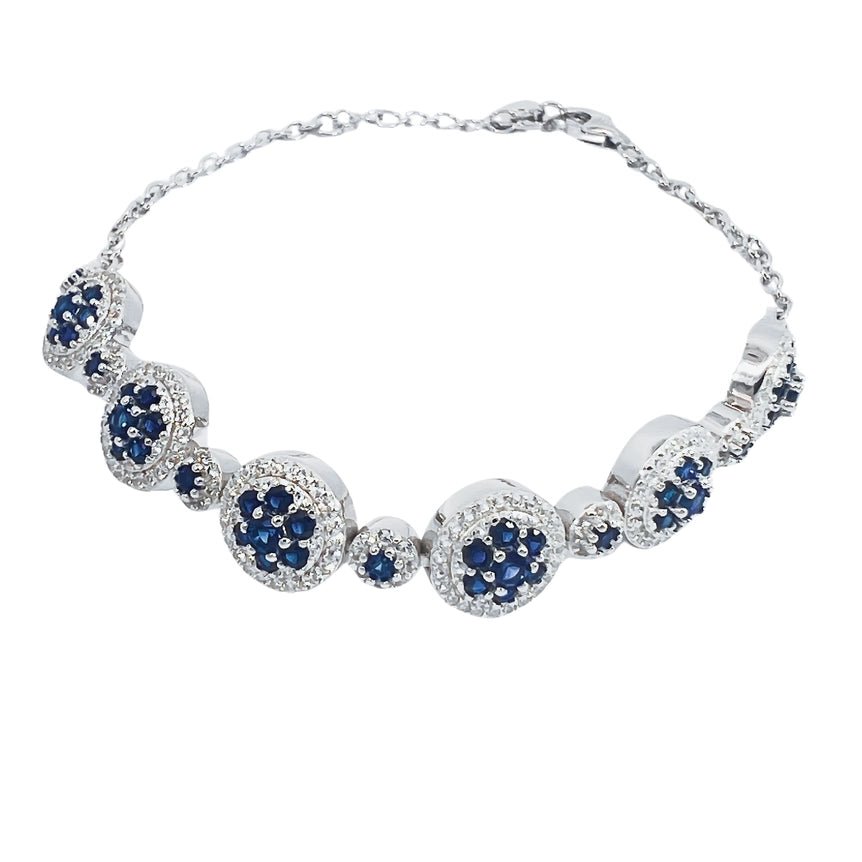 Bracelet Type: Tennis Bracelet Metal: 925 Sterling Silver with Rhodium Plating Weight: 8.89 grams Length: 7 inches with 1-inch adjustable extension Main Stones: Created Blue Sapphires & Created White Sapphires Blue Sapphire Sizes & Quantity: 2.0 mm Round – 7 pcs 2.5 mm Round – 6 pcs 1.9 mm Round – 36 pcs White Sapphire Sizes & Quantity: 0.8 mm Round – 36 pcs 1.0 mm Round – 138 pcs 1.1 mm Round – 56 pcs