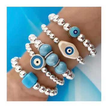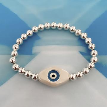 #4- ROUND CERAMIC BEAD WITH EYE AND 6MM HEMATITE SILVER PLATED BEADS, STRETCH