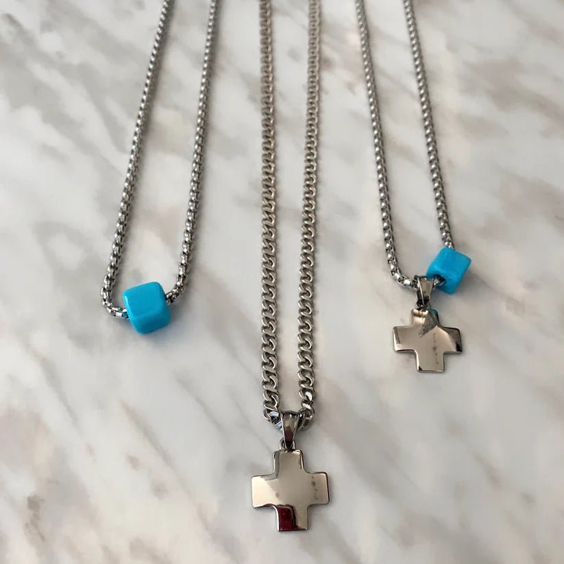 Stainless steel chains with stainless steel cross. Each sold separately, 3 styles measuring 20 inches. Priced from left to right