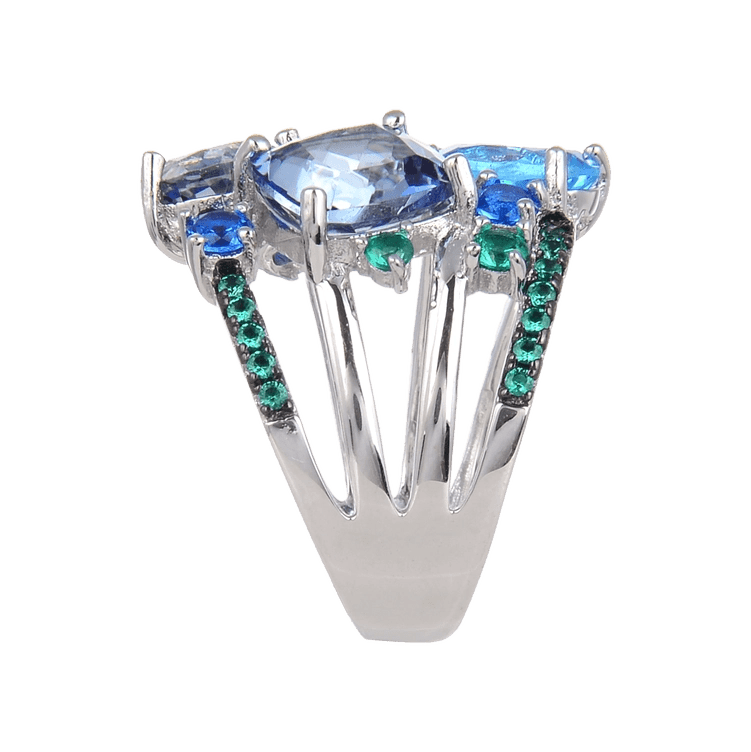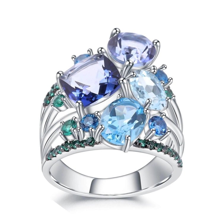 The 925 Sterling Silver band of this gorgeous ring has Round, Cushion and Oval cut 1.83 ct Mystic Quartz and Blue Topaz are featured in this incredible cocktail ring. The varied shades of blue in this piece show the versatility of Mystic Quartz and Blue Topaz, accenting the flattering style of this stunning gemstone! This ring has a unique combination of two birthstones, Quartz, the April birthstone & Topaz, the December Birthstone. Both these gemstones have stunning blue hues, and together they complement each other.